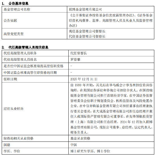 根据公告,离任的督察长方芳女士是基金行业合规领域的资深人士。她拥有上海财经大学金融学背景,职业生涯起步于德勤、安永等国际会计师事务所,随后在申万菱信、中信保诚、凯石等多家公募基金积累了丰富的监察稽核经验。在加入联博基金前,她已在外资机构富达基金(中国)担任督察长,并于2024年3月出任联博基金督察长,任期约21个月。其离任理由为常规的“个人原因”。